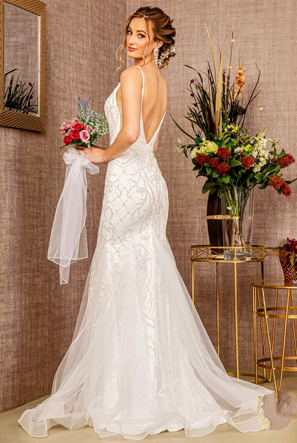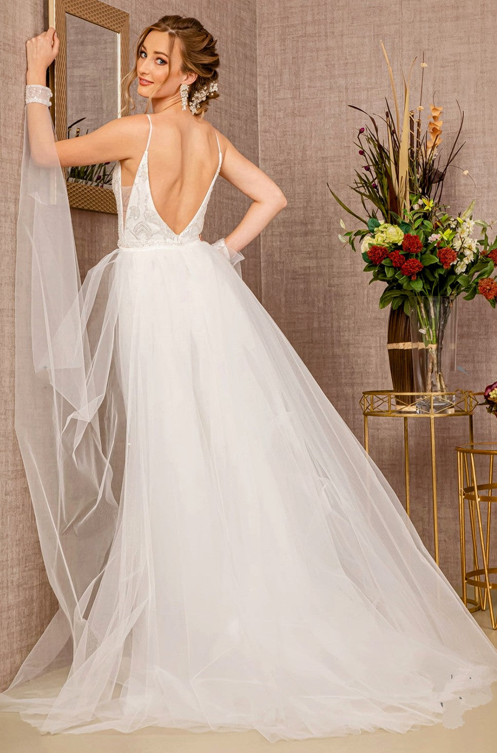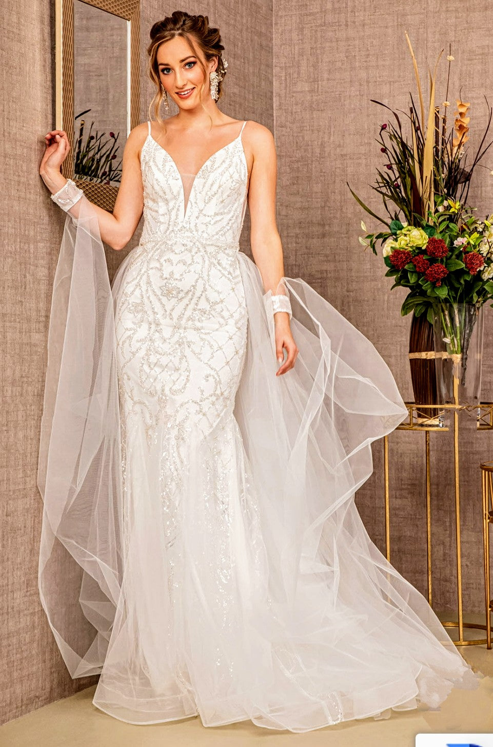 Beautify your special day in this exquisite 3157 wedding dress. This unique design features a jewel bead mermaid style with a detachable waist long mesh layer for elegant movement. Feel your most beautiful and confident walking down the aisle in this stunning ensemble.