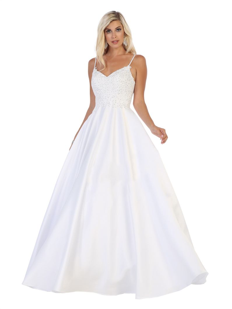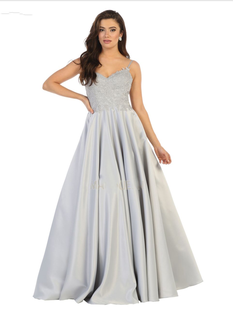 A-line dress with spaghetti straps a zipper back and a lace applique bodice with iridescent stones