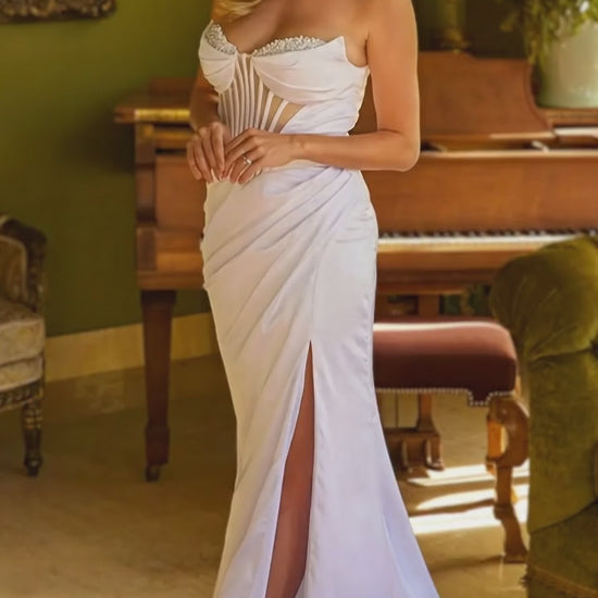 This elegant floor-length gown features a fitted silhouette with a sweetheart neckline and a structured corset bodice. Adorned with beads, jewels, and sequins, it offers subtle sparkle complemented by delicate mesh panels and tasteful waistline gathering. A front slit adds a touch of allure, while the luxurious satin fabric ensures a refined and graceful appearance for any formal occasion.