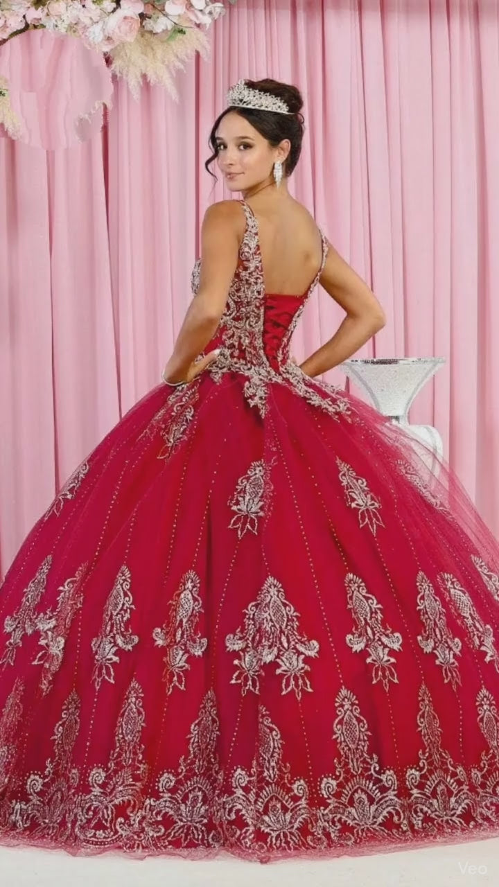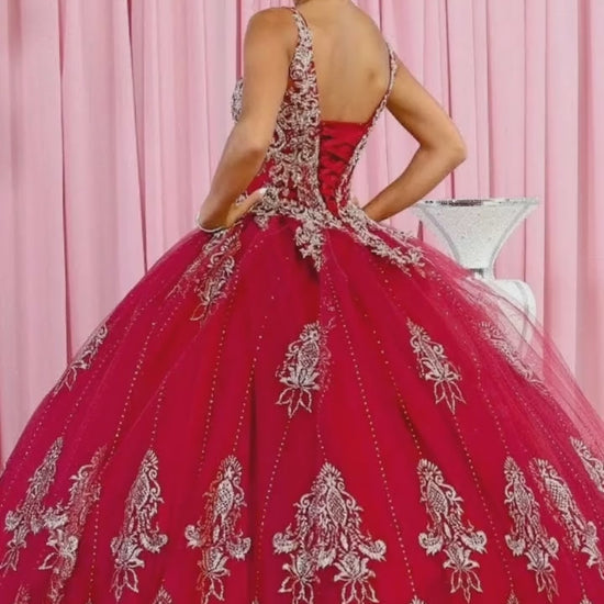 Elevate your quinceanera celebration with this exquisite ball gown featuring a delicately beaded V-neckline. The voluminous silhouette creates a regal presence, while intricate embroidery and glittering embellishments cascade throughout the design. A beautifully bordered hemline completes this sophisticated creation, ensuring you command attention during your momentous occasion.