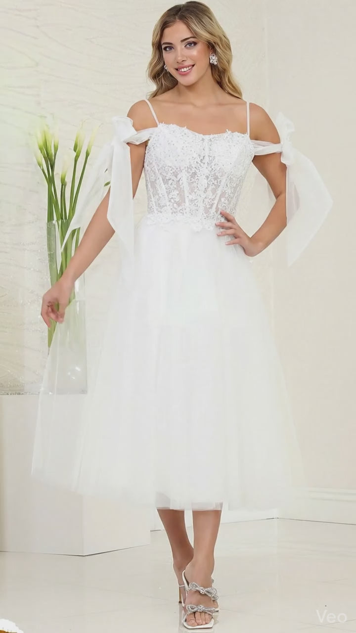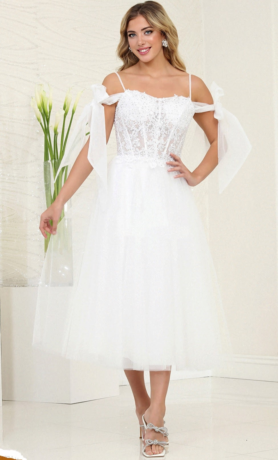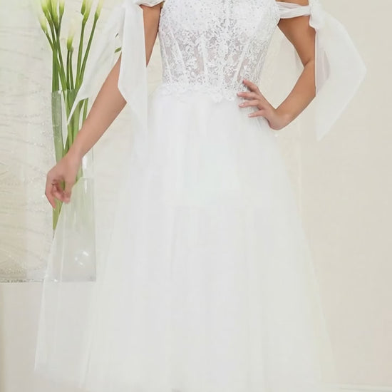 Elegant white tulle gown featuring delicate lace appliqués and a sheer bodice that exudes timeless sophistication. Supported by slender spaghetti straps, this T-length design offers graceful movement while maintaining refined charm. Perfect for formal occasions where understated luxury speaks volumes.
