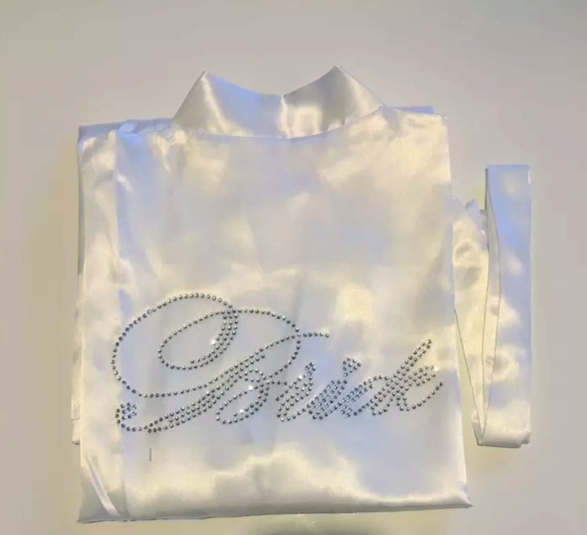 Women silky satin short wedding party robes in white with rhinestone embellishment. 100% polyester with a silky texture and luxurious look with 3/4 sleeves, below the hip length and detachable self-belt for adjustment at waist. Great as a bathrobe, housecoat, dressing gown, bridal party robe, etc. Sizes run small.